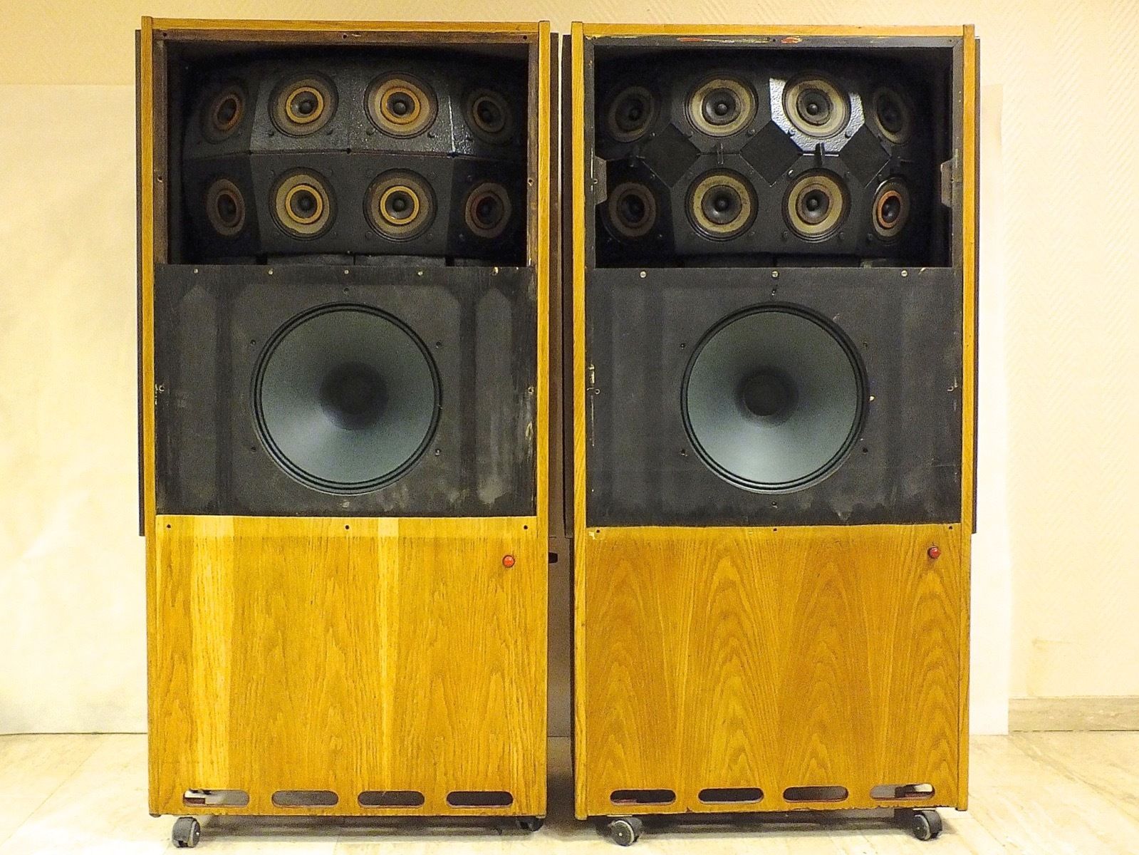 | [#17050] EMI RLS10 EMI RLS10是EMI錄音室專用的監聽揚聲器的歷史照片,在英國著名的Abbey Road錄音室內被稱為EMI White Elephant大白象揚聲器。此揚聲器是由15吋Wharfedale低音是揚聲器單元、2組EMI 92390G 13吋x8吋橢圓中音揚聲器單元,以及6組GEC BCS 1835高音揚聲器單元構成! ![]() |