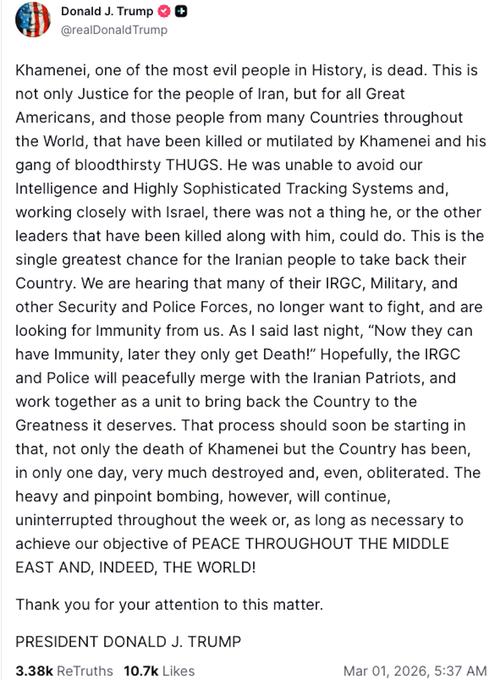 | [#221] 伊朗反政府示威 呵呵 ~~ 惡貫滿盈斷斤秤,睇完會唔會晚晚瞓唔著 ... -- 特朗普指:「他無法逃脫我們高度精密的情報和追蹤系統,再加上與以色列的密切合作,他和與他一同被擊斃的其他領導人都無計可施。這是伊朗人民奪回國家的最佳機會。我們聽說,伊朗伊斯蘭革命衛隊、軍隊以及其他安全和警察部隊中的許多人已經不想戰鬥,並尋求我們的赦免。」 原文網址: 伊朗官媒:哈梅內伊身亡 女兒和孫兒同樣喪生|最新 | 香港01 https://www.hk01.com/article/60325956?utm_source=01articlecopy&utm_medium=referral ![]() |