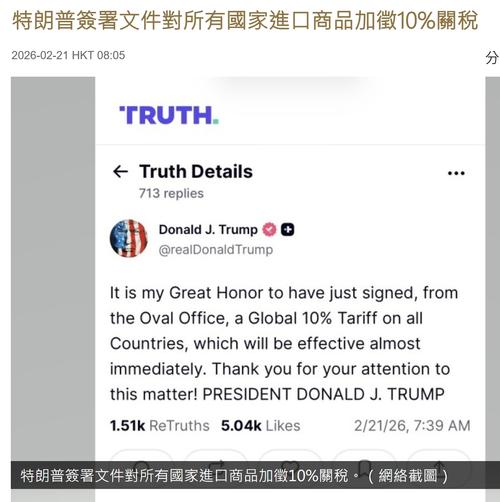 | [#550] 關稅戰 其實簽個名,廢除法院權力味得囉 ~~ 嘿嘿 ... -- 美國總統特朗普在旗下社交平台表示,他已簽署文件,對所有國家的進口商品加徵10%的關稅,指關稅將幾乎立即生效。 白宮說,特朗普簽署一項徵收臨時進口關稅的公告,對進口到美國的商品徵收為期150日,稅率一成的從價關稅。臨時進口關稅將於美國東部2月24日凌晨生效。 白宮補充,部分商品將獲得豁免,包括私家車、部分輕型貨車和部分航空航天產品,亦包括一些自然資源和化肥產品。 白宮又說,根據《國際緊急經濟權力法》徵收的額外價稅將不再有效,並且應盡快停止徵收。 美國聯邦最高法院裁定,特朗普引用《國際緊急經濟權力法》實施全球多國徵收關稅不合法,法律並未賦予特朗普宣稱徵收關稅的權力。特朗普譴責裁決糟糕、充滿問題,對法院部分成員感到羞恥。 新聞來添:https://news.rthk.hk/rthk/ch/component/k2/1844508-20260221.htm?spTabChangeable=0 ![]() |