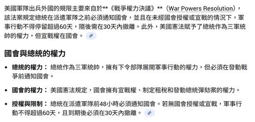 | [#56] 「富豪淫媒」愛潑斯坦檔案,魔鬼名冊 是對的。 。 TACO 最叻走法律罅 。。 -- 美國軍隊出兵外國的規限主要來自於**《戰爭權力決議》**(War Powers Resolution),該法案規定總統在派遣軍隊之前必須通知國會,並且在未經國會授權或宣戰的情況下,軍事行動不得停留超過60天,隨後需在30天內撤離。此外,美國憲法賦予了總統作為三軍統帥的權力,但宣戰權在國會。 ![]() |