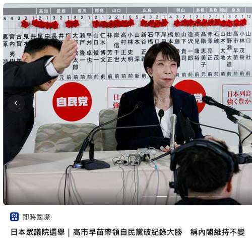 | [#101] 日本政壇有望首現女性首相 呢招都高,只求奪取眾議院三分二議席,閣員全部留任。 -- 日本首相、自民黨總裁高市早苗2月8日帶領自民黨在眾議院選舉中取得大勝,她在選舉後當日透露新一屆內閣人事安排將維持不變。此外,高市還將在9日與日本維新會黨首吉村洋文舉行會談,確認繼續聯合執政,並在當晚於自民黨總部會見傳媒,簡報今後執政方針。 高市早苗在8日的電視節目中談及人事安排,稱「現任閣僚上任才三個多月,他們的政績逐步顯現,不打算換人」 原文網址: 日本眾議院選舉|高市早苗帶領自民黨破紀錄大勝 稱內閣維持不變 | 香港01 https://www.hk01.com/article/60320493?utm_source=01articlecopy&utm_medium=referral ![]() |