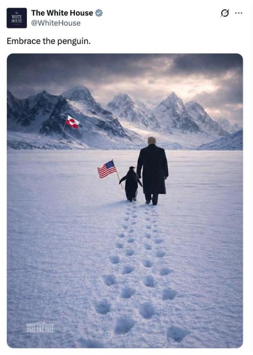 | [#165] 特朗普再次揚言並吞格陵蘭島之日“將來臨” 又鬧出一個大笑話 ~ 夢想侵佔阿蘭,已經係笑話收場, 冰島當係格0蘭,再笑多次。。 拖隻企鵝出嚟行北極圈 ~ 真係頂您唔順 .. 想唔認痴呆都唔得囉。。 -- 格陵蘭的風波暫告一段落,但美國總統特朗普顯然未放棄對格島的夢想。白宮周六(24日)在社交平台X上傳一張AI合成貼圖,顯示特朗普在白雪皚皚的環境中與企鵝同行的背影,企鵝手持美國國旗象徵已經歸順,另有格陵蘭旗。這張合成圖隨即鬧出大笑話,因為格陵蘭屬北半球,根本沒有企鵝棲息,而企鵝只會在南半球國家和南極洲生活。 在這張AI生成圖片中,79歲的特朗普似牽着一隻企鵝,正一步步走向格陵蘭島。圖片說明文字為「擁抱企鵝」(Embrace the penguin)。 來源網址 : 格陵蘭之爭-特朗普牽企鵝漫步格陵蘭-白宮貼AI圖鬧大笑話 | 星島頭條 https://www.stheadline.com/realtime-world/3538478/ ![]() ![]() 最後修改時間: 2026-01-24 16:59:14 |