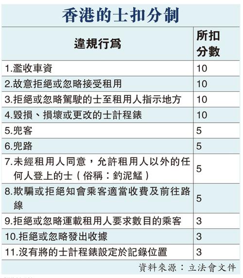 [#26] 點樣投訴的士司機拒載? 在的士司機違例記分制度下,當某的士司機在任何兩年期間被記的分數累計至指定水平時,便會觸發相應的行動或罰則。 具體而言,若被記 8 至 14 分,運輸署署長會向該的士司機送達一份的士司機違例記分提示;若被記 10 分或以上,該的士司機須在指定限期內自費修習 和完成的士服務改進課程。另外,若被記 15 分或以上,該的士司機可被取消駕駛的士資格。 |