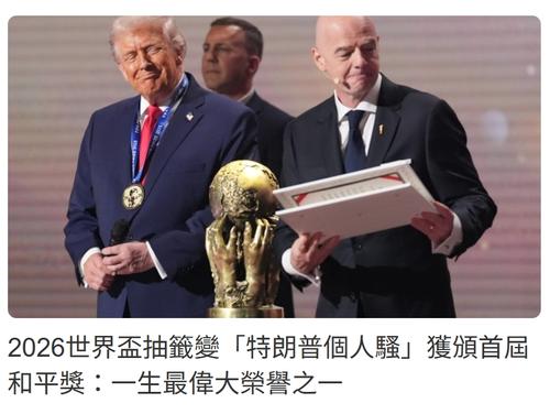 | [#447] 關稅戰 似乎大家都掌握到,要同 TACO 交手, 唔想算外生枝。就要奉承擦鞋, 咁就可以收服個貪威識食小氣鬼 。 。 嗱,恨有和平獎嘛,做個俾您囉,大家都開心 ... 氹鬼食豆腐喎。。 呵呵 ~~ -- 國際足協(FIFA)昨日在美國華盛頓舉行 2026 年美墨加世界盃決賽周抽籤儀式,全球球迷關注,而場內另一焦點則落在美國總統特朗普身上。儘管他今年與和平獎失之交臂,國際足協卻破天荒向他頒發首設的「和平獎」,表揚其「對和平的貢獻」。特朗普形容,這是他「一生中最偉大的榮譽之一」。 波切利獻唱揭序幕 特朗普最愛歌曲成開場 整個抽籤活動被多家外國通訊社形容為「特朗普個人騷」,從音樂到儀式安排都滿載其個人風格。 ![]() |