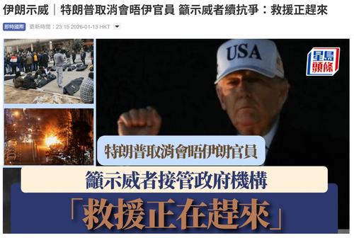 | [#488] 美軍重捶委內瑞拉 第4度炸沉毒梟船 伊朗反政府示威局勢急劇惡化,美國總統特朗普周二(13日)發出最強硬警告,公開呼籲伊朗示威者接管政府機構,並宣布取消與伊朗官員的所有會面,直至殺戮停止,又稱「救援快來到」、政權須「付出沉重代價」。 來源網址 : 伊朗示威特朗普取消會晤伊官員-籲示威者續抗爭救援正趕來 | 星島頭條 https://www.stheadline.com/realtime-world/3535233/ ![]() |