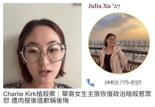 | [#236] 特朗普盟友 右翼名嘴Charlie Kirk出席公開活動時遭槍擊 原文網址: 特朗普盟友 右翼名嘴 無腦嘅人,自然會講出無腦嘅說話。。 政治暴力環境長大,自然支持暴力解決政治問題。 -- 美國保守派政治網紅、特朗普總統政治盟友柯克(Charlie Kirk)遭槍擊後,美國歐柏林學院一名徐姓中國女留學生日前在網絡公然表示,她在課堂上討論事件主張恢復政治暗殺,還引用毛澤東語錄指有些人「不應享有言論自由」。 影片引發網友瘋傳之後,徐女遭撻伐且遭肉搜,更有不少人要求將她驅逐出境。《紐約郵報》報道,徐女受訪時對於發言表示道歉,非常後悔。 徐女在片中自稱,她是課堂上唯一舉手發言的人,且她當時就表示,自己「向來認為應該恢復政治暗殺」,而她對於政治暗殺「並不感到難過」,也「不覺得有什麼不對」。 ![]() |