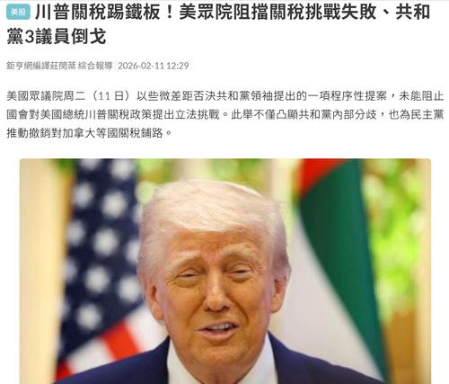 | [#323] 加拿大這個總理卡尼有膽色,有遠見,有魄力,真正能為自已國家市民辦事的人. 國民未有機會以選票表態, 自己黨友又再度翻檯。。 可能未使等年尾中期選舉,已經要做跛腳鴨。。 加拿大有望唔使做第 51州 ~ -- 美國眾議院周二(11 日)以些微差距否決共和黨領袖提出的一項程序性提案,未能阻止國會對美國總統川普關稅政策提出立法挑戰。此舉不僅凸顯共和黨內部分歧,也為民主黨推動撤銷對加拿大等國關稅鋪路。 根據《路透》報導,眾議院以 217 票對 214 票否決該提案,其中 3 名共和黨議員加入民主黨陣營投下反對票。 該提案原本透過一項程序性規則,將「禁止在 7 月 31 日前挑戰關稅」的條款,納入一項僅用於啟動三項不相關法案辯論的議程安排中,最終隨整體規則遭否決而失效。 民主黨則希望最早於周三(11 日)迫使眾議院進行表決,終止川普以「國家緊急狀態」為由,對加拿大商品實施懲罰性貿易措施的權力;此外,民主黨也已提出決議案,試圖推翻川普對墨西哥及其他國家實施的關稅。 不過,《彭博》指出,即使眾議院真的投票通過撤銷川普的關稅措施,也不太可能迫使他讓步,因為聯合決議案必須由總統簽署後才能成為法律,否則國會必須在參眾兩院都獲得三分之二的多數票,才能推翻川普的否決權。 新聞來源:https://news.cnyes.com/news/id/6341858 ![]() 最後修改時間: 2026-02-11 19:04:11 |