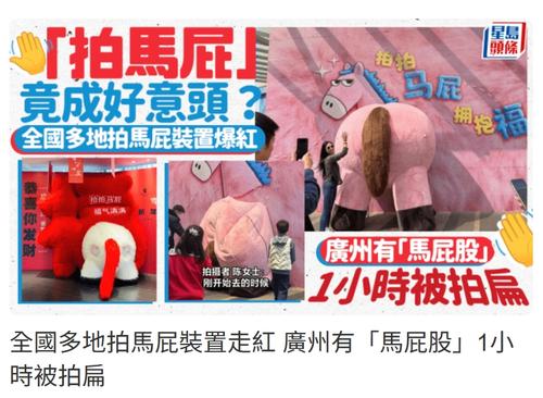 | [#14] 農曆年有咩搞? 呢個有新意 ~~ 唔知正腫門唔開,會唔會擺返隻應下節呢 .... 圖片來源:https://www.stheadline.com/china-topics/3543644/全國多地拍馬屁裝置走紅-廣州有馬屁股1小時被拍扁 ![]() |