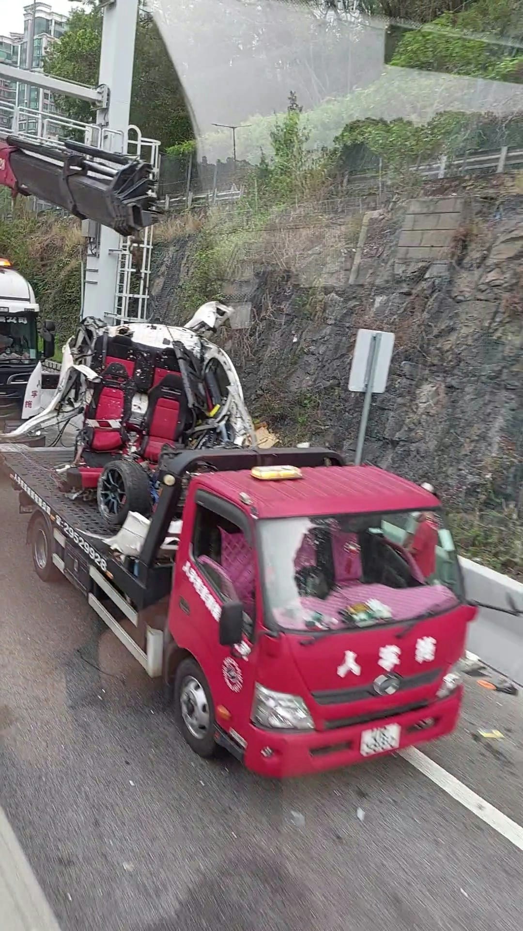 | [#4] 屯門公路私家車撞龍門架斷兩截 積木車,後座沒配帶安全帶? |