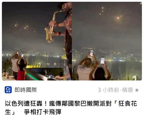 | [#26] 伊朗準備向以色列掟核彈? 煙花匯演,有人快活,有人愁 ~~ -- 以色列13日發起「崛起之獅」突襲行動,重創伊朗軍事設施,殲滅伊朗軍方高層與核子科學家,但也招致德黑蘭發射大量飛彈報復。 與此同時,位於以色列北部的鄰國黎巴嫩,卻出現民眾在露天酒吧聚會狂歡,甚至搶拍飛彈的「魔幻」畫面。 影片中,樂手站在高處陶醉演奏,DJ也認真播放音樂,看起來正在舉行一場社交聚餐。隨着飛彈劃過遠方夜空,客人們紛紛起身,爭相拿出手機錄影,現場氣氛非常輕鬆愉悅,絲毫沒有目睹戰火的緊張不安。 ![]() |