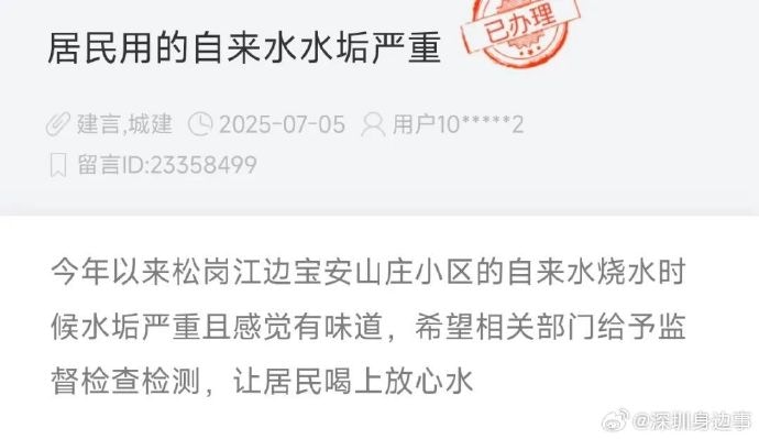 | [#91] 深圳進一步搶香港生意 深圳居民投訴自來水異味嚴重「燒水全是垢」 官方:水硬度較高 近日有深圳市民反映自來水出現異常,引發關注。據《澎湃新聞》報道,一名深圳市民於人民網「領導留言板」留言稱,深圳市寶安區松崗街道寶安山莊小區的自來水在燒開後水垢嚴重且有味道,擔憂影響居民健康,希望有關部門介入檢測,保障飲水安全。 對此,深圳市深水寶安水務集團有限公司(下稱「深水寶安水務公司」)回應指出,經現場檢測水質合格,並走訪周邊商戶及業主,未發現水質異常現象。初步分析認為,用戶所反映的「燒水後水垢嚴重」現象與自來水水源中「硬度指標」較高有關,屬於正常物理現象。 深水寶安水務公司表示,深圳自2024年6月起已正式引入西江水源,在東江水源基礎上形成「東西雙水源」供水格局。西江水發源於雲南省曲靖市烏蒙山脈,流經貴州、廣西後進入廣東,覆蓋受水區人口超過3200萬。與東江水相比,西江水硬度相對較高。該公司指:「燒開的自來水中出現水垢屬於正常現象,這主要和水中的硬度指標有關,硬度越高,水垢現象越明顯。」 根據《生活飲用水衛生標準》(GB5749-2022),自來水總硬度限值為450mg/L,與世界衛生組織標準相近,而深圳市自來水硬度介乎30至120mg/L之間,遠低於標準上限。對於水壺中吸附的水垢,水務公司建議可使用檸檬酸除垢劑或白醋清除。 深水寶安水務公司補充稱,在解釋說明後,涉事用戶已表示理解。公司未來將進一步加強對所轄供水管網的水質巡查及管理,一旦發現問題將即時跟進處理,並持續關注該片區水質變化。 事實上,今年1月亦有深圳寶安區金沙名都小區居民反映自來水煮沸後出現漂浮物。當時水務公司同樣解釋:「我司現在使用西江原水,西江水硬度比東江水高,燒開的自來水中出現水垢屬於正常現象。」 與此同時,廣東江門地區也於近日爆出類似情況。據《澎湃新聞》7月9日報道,不少江門市民反映自家自來水呈黃色,有異味,導致大批居民不敢飲用,只能搶購礦泉水。當地供水公司江門公用水務環境股份有限公司表示,此次變色與水廠制水工藝調整有關,並稱:「雖然水的色度變深,但經監測水質沒有問題。」 江門市民李女士在接受媒體訪問時憂心表示:「最近幾天,家裏做飯刷牙洗臉都是買的桶裝水,囤了好幾桶水,生活非常不方便。」更有居民在社交平台苦中作樂調侃:「炒菜省了放醬油。」 雖然兩地官方均指水質符合國家標準,但市民對水質的直觀觀感顯示,水色、水垢與氣味等因素仍深深影響居民的生活便利與安全感。 Source: 連登 https://www.hk01.com/北上廣東/60256322/深圳居民投訴自來水異味嚴重-燒水全是垢-官方-水硬度較高 ![]() ![]() ![]() 最後修改時間: 2025-07-14 22:50:27 |
