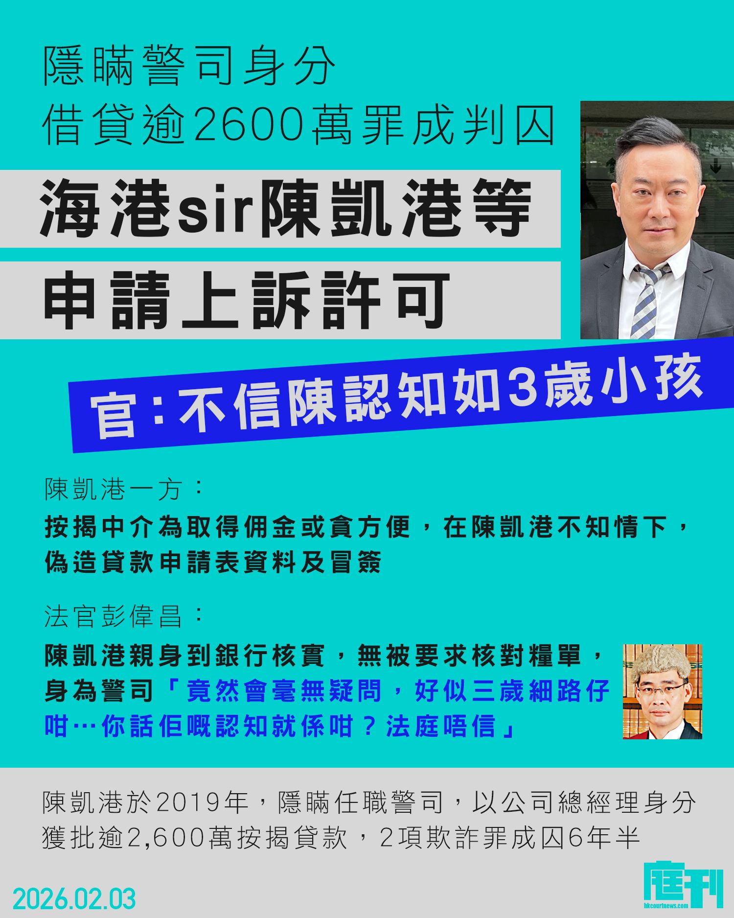 [#168] 《警察犯案系列》 ![]() https://www.hk01.com/社會新聞/60318959/海港sir-陳凱港隱瞞身份借2600萬-提上訴稱有披露任職警司 人稱「海港Sir」的警司陳凱港,被指與一名男商人於2019年串謀向兩間銀行隱瞞其警司身份,並訛稱受聘於私人公司,以獲取逾2600萬元的按揭貸款。兩人被裁定欺詐罪成,陳和商人分別被判監6年半和5年。兩人就定罪和判刑提出上訴,案件今(3日)在上訴庭處理。代表陳凱港的律師陳詞稱,陳有把警司糧單等文件交予按揭貸款代理,亦指陳有向銀行稱他是警司,疑代理為賺取佣金,在申請時造假。上訴庭法官質疑為何當時會未對核對清楚,聽取陳詞後稱,會在6個月內下裁決。 上訴人陳凱港及汪浩毅,同被控兩項欺詐罪。經審訊後,陳被裁定兩罪均成立,汪則首罪罪成。 陳稱有把警司糧單等資料交多代理 就陳向東亞銀行申請按揭貸款時,未有提交警司的糧單,代表陳凱港的資深大律師許紹鼎陳詞指,陳把警司糧單和涉案的出眾分紅協議等交予按揭貸款代理,由代理處理申請,質疑代理疑為了賺取佣金,在案中做假。陳之後到東亞的辦公室核對資料,沒有看過申請表。 官質疑為何當時未核對資料 三名法官多番質疑其說法,其中法官楊家雄指身居要職的人,都應知道申請表重要,但陳竟稱前往核對資料時,沒有看過申請表。法官陳慶偉則指,若代理作假,為何他們處理申請時,不提及陳的15萬元警司月薪。許回應指,代理可能「貪方便」,認為只以出眾分紅協議,足以令銀行批准申請,不需再呈交其他資料。 強調陳有向銀行透露是警 許強調,控方案情有很多疑點,原審法官未有處理,如陳之後到東亞的一間馬鞍山分行開戶,以作日後還款之用,當時陳有向銀行職員稱他是警司。判刑方面,許指原審法官採納過高的量刑起點,又指陳曾經償還涉款。 案件編號:CACC111/2024CACC111/2024 最後修改時間: 2026-02-04 23:27:09 |