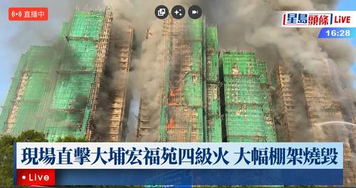 | [#3] 大埔宏福苑火警升為四級 大埔宏福苑棚架四級火 蔓延其他樓宇 兩男女燒傷昏迷 今日(26日)下午2時51分,宏福苑宏昌閣外牆棚架起火,驚動多人報案。消防到場動用一隊搜救隊撲救,火警於下午3時02分升為三級,至下午3時34分再升為四級,消防動用最少兩條喉及兩隊煙帽隊灌救。據知現場頻繁傳出爆炸聲,有多名居民求助,稱未能逃生;兩名男女嚴重燒傷,陷入昏迷。大火其後蔓延到宏泰閣等樓宇。 https://www.hk01.com/article/60297831 |