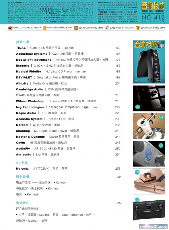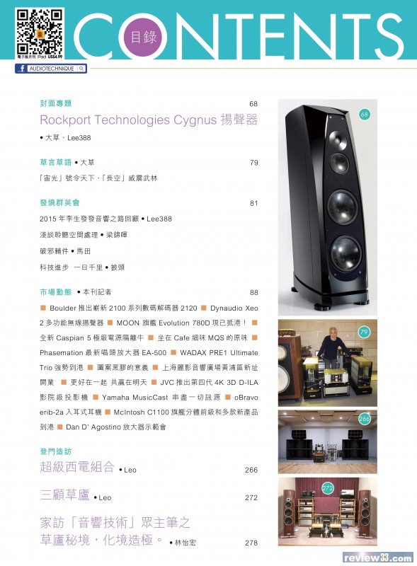 2016年1月嘅第一期封面專題為大家帶來Rockport Technologies Cygnus揚聲器,大草哥操刀介紹「宙光」號令天下.「長空」威震武林,Leo大哥同林怡宏(台灣)同你講述“草廬"好聲之謎,其他內容包括: TIDAL| Camira LS解碼連前級 Lee388 Acoustical Systems| AQUILAR唱臂.梁錦暉 Modwright Instrument| PH150分體式真空管唱頭放大器.披頭 Esoteric| C-02X + S-02前後級放大器.鍾啟源 Musical Fidelity| Nu-Vista CD Player.Iceman Alluxity| Media One 播放機.紅人 Wilmer Workshop | Ultimate DSD DAC解碼器.鍾啟源 bsg Technologies | qøl Signal Completion Stage.Leo Rogue Audio|RP-5 膽前級.加里