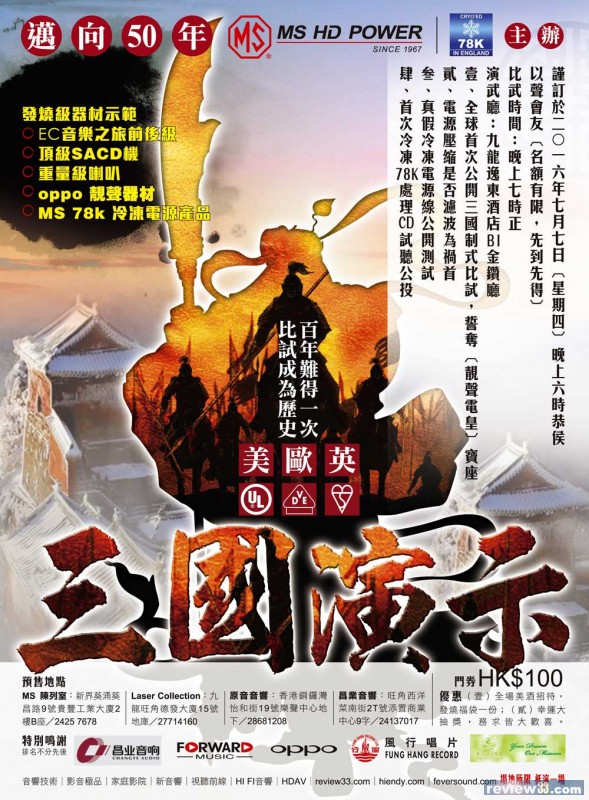 7 月7 日當晚 6:00pm happy hour 開始入場,已購票的朋友們可免費咖啡、茶外,紅酒、威士忌招待,令大家開心交流 HiFi 經。現場為公平投票選誰國好聲音,特別安排三部 OPPO 105D 分開不同國家制式給大家用耳機盲選投票外。7 時正式開始以全套「EC 音樂之旅」大型器材進行公開三國大戰評測。專人講解真假冷凍電源線分別令發燒友可深入了解 。 當然當晚幸運大抽獎不可缺少 有機會贏取特別版 CD 及 ms 電源產品外,憑票尾更可作現金 200 元於 8 月 5-7 日到香港視聽展 Hall 3 J11-13 ms 攤位購買指定產品。