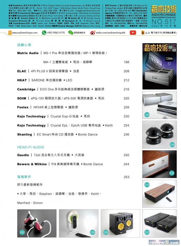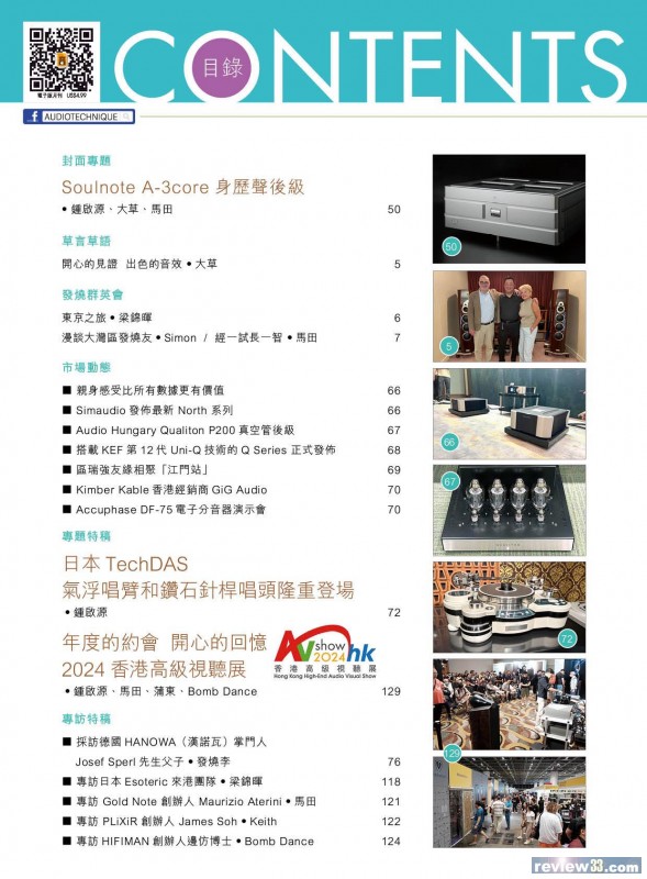 今期封面專題由鍾啟源、大草、馬田評論Soulnote A-3core身歷聲後級。專題特稿:年度的約會 開心的回憶2024香港高級視聽展、日本TechDAS氣浮唱臂和鑽石針桿唱頭隆重登場。專訪特稿 :採訪德國HANOWA(漢諾瓦)掌門人Josef Sperl先生父子、專訪日本Esoteric來港團隊、專訪 Gold Note 創辦人 Maurizio Aterini、專訪 PLiXiR 創辦人 James Soh、專訪HIFIMAN創辦人邊仿博士。 其他評論文章包括:Matrix Audio MS-1 Pre 串流音樂播放器 / MP-1 解碼前級 / MA-1 立體聲後級 、ELAC 4PI PLUS V超高音揚聲器、HKAT SARONE 串流播放機 、Cambridge EVO One多功能無線流媒體揚聲器、SOtM sPQ-100 唱頭放大器 / sPS-500 電源供應器 、Fostex NF04R桌上型揚聲器、Kojo Technology Crystal Eop-G地盒、Kojo Technology Crystal EpL、EpUA USB 專用地盒、Shanling EC Smart時尚CD播放器 、Gaudio Tödi混合單元入耳式耳機、Bowers & Wilkins Pi8真無線降噪耳機。詳細內容請參閱目錄。
