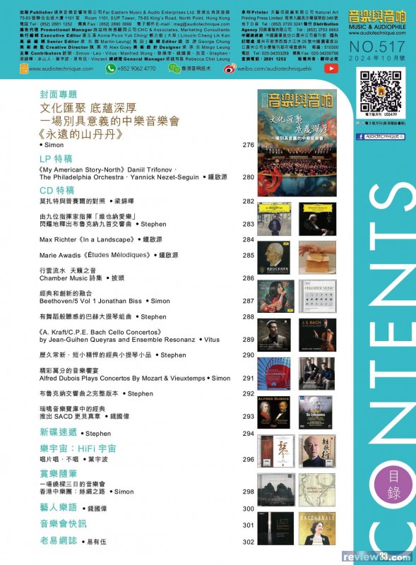 今期的音樂與音响封面專題 :文化匯聚 底蘊深厚 一場別具意義的中樂音樂會。LP特稿: 《My American Story-North》Daniil Trifonov。CD特稿: 莫扎特與普賽爾的對照、由九位指揮家指揮「維也納愛樂」閃耀地釋出布魯克納九首交響曲、Max Richter《In a Landscape》、Marie Awadis《Études Mélodiques》 、行雲流水 天籟之音Chamber Music詩集、經典和創新的融合 Beethoven/5 Vol 1 Jonathan Biss、有舞蹈般聽感的巴赫大提琴組曲 、《A. Kraft/C.P.E. Bach Cello Concertos》by Jean-Guihen Queyras and Ensemble Resonanz 、歷久常新.短小精悍的經典小提琴小品、Alfred Dubois Plays Concertos By Mozart & Vieuxtemps 、布魯克納交響曲之完整版本、瑞鳴音樂寶庫中的經典推出SACD更見真章 。其餘的新碟速遞、HiFi宇宙、賞樂隨筆、藝人樂語、老易網誌 …等等欄目也是同樣內容豐富,記緊捧場啊!