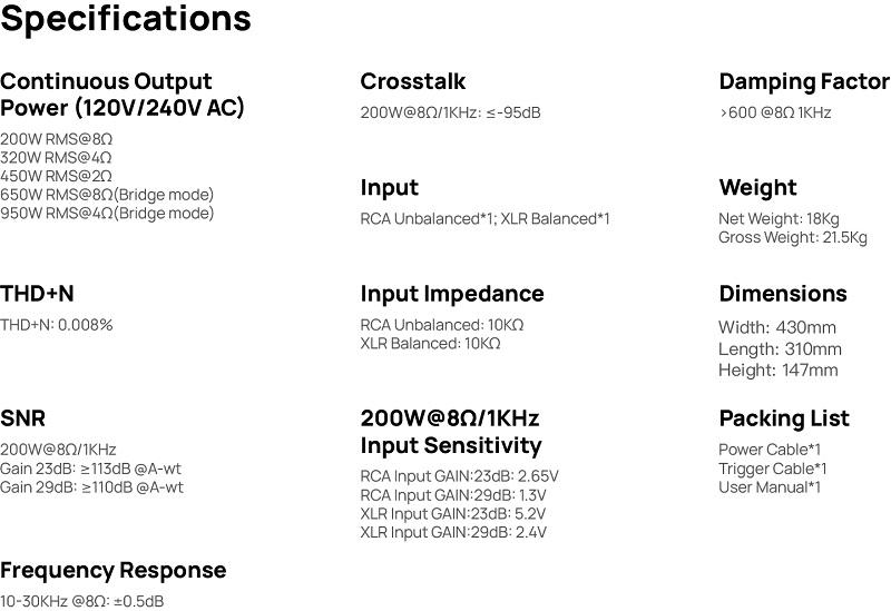 *在 8 歐姆條件下,每聲道可提供 200W 的輸出功率,橋接模式下可達 650W。
