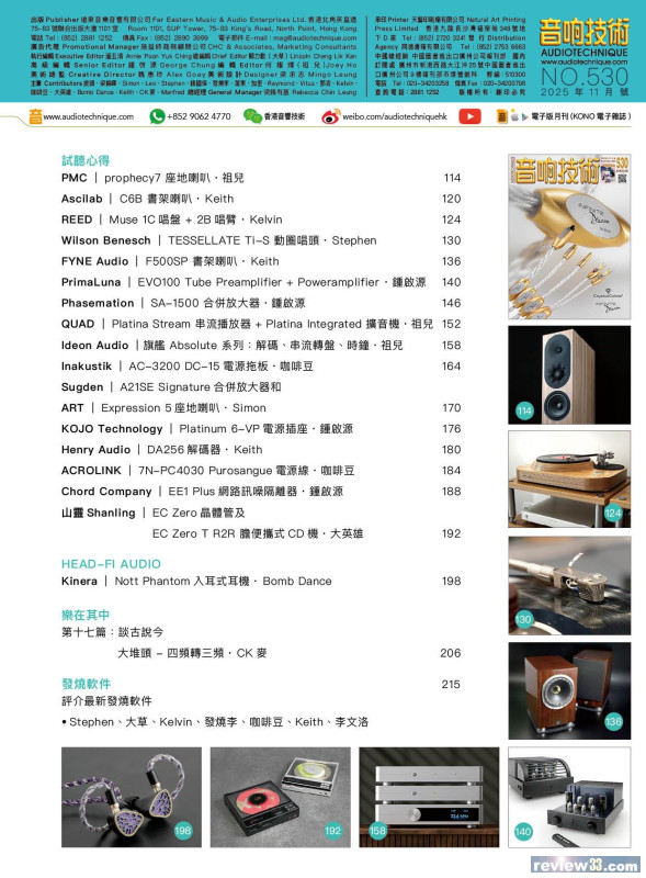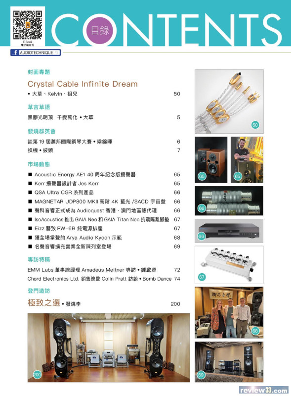 今期封面專題由 大草、Kelvin、祖兒評論 Crystal Cable Infinite Dream。專訪特稿 :EMM Labs董事總經理Amadeus Meitner專訪、Chord Electronics Ltd. 銷售總監 Colin Pratt 訪談。其他評論文章包括:PMC prophecy7 座地喇叭、Ascilab C6B 書架喇叭、REED Muse 1C唱盤 + 2B唱臂、Wilson Benesch TESSELLATE Ti-S 動圈唱頭、FYNE Audio F500SP 書架喇叭、PrimaLuna EVO100 Tube Preamplifier + Poweramplifier 、Phasemation SA-1500 合併放大器、QUAD Platina Stream 串流播放器 + Platina Integrated 擴音機、Ideon Audio 旗艦 Absolute 系列:解碼、串流轉盤和時鐘、Inakustik AC-3200 DC-15電源拖板、Sugden A21SE Signature合併放大器和ART Expression 5座地喇叭、KOJO Technology Platinum 6-VP電源插座、Henry Audio DA256解碼器、ACROLINK 7N-PC4030 Purosangue電源線、Chord Company EE1 Plus網路訊噪隔離器、山靈Shanling EC Zero晶體管及EC Zero T R2R 膽便攜式CD機、Kinera Nott Phantom入耳式耳機。詳細內容請參閱目錄。