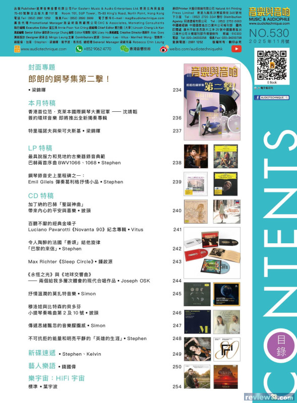 今期的音樂與音响封面專題 : 郎朗的鋼琴集第二擊!本月特稿 : 香港首位范.克萊本國際鋼琴大賽冠軍 —— 沈靖韜簽約環球音樂 即將推出全新獨奏專輯、特里福諾夫與柴可夫斯基。LP特稿 : 最具說服力和見地的古樂器錄音典範 巴赫兩首序曲BWV1066、1068、鋼琴錄音史上里程碑之一:Emil Gilels 彈奏葛利格抒情小品。CD特稿 : 加丁納的巴赫「聖誕神曲」帶來內心的平安與喜樂、Luciano Pavarotti 《Novanta 90》紀念專輯、令人陶醉的法國「香頌」結他旋律「巴黎的來信」、Max Richter《Sleep Circle》、《永恆之光》與《地球交響曲》—— 兩個給我多層次體會的現代合唱作品、抒情溫潤的莫扎特音樂、穆洛娃與比特森的貝多芬小提琴奏鳴曲第2及10號、傳遞思緒飄忽的音樂朦朧感、不可抗拒的能量和明亮平靜的「英雄的生涯」。其餘的新碟速遞、藝人樂語、HiFi宇宙 …等等欄目也是同樣內容豐富,記緊捧場啊!