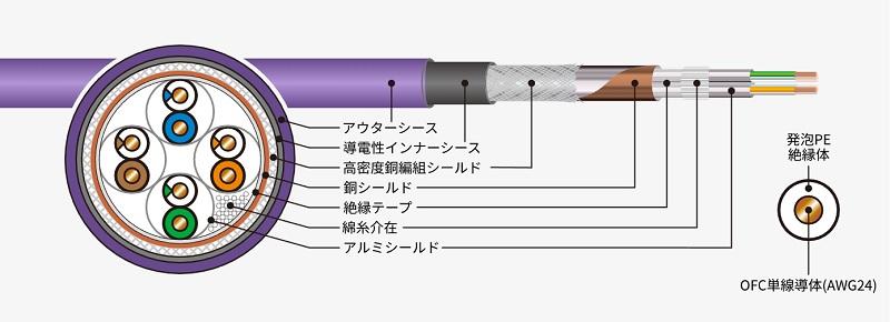 透過鋁、銅、高密度銅等不同材質所組合而成的三層屏蔽結構,可在高水準下抑制輻射噪訊與外來串音(Alien Crosstalk),實現有效防止外部噪訊侵入的高機能屏蔽效果。