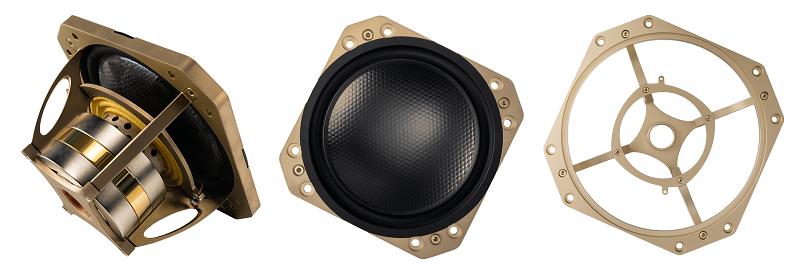 IronFree8 Gold Signature 低音單體採用三層複合振膜:以芳綸蜂巢核心夾在兩層碳纖維外層之間。此結構在各方向都具備極高剛性,同時保持極低重量。碳纖維外層能抑制振動與共振( 包括超出單體工作頻段的共振 ),而芳綸核心則在垂直方向提供極佳的剛性重量比。