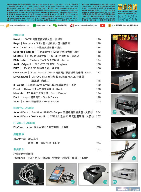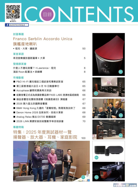 今期封面專題由祖兒、大草、鍾啟源評論 Franco Serblin Accordo Unica 旗艦座地喇叭。專題特稿 :特集:2025年度測試器材一覽 ——揚聲器、放大器、耳機、家庭影院 。其他評論文章包括:Kondo G-72i真空管前級放大器、Rega Mercury + Solis前、後級放大器、dCS Lina DAC X 串流音樂播放器.Skogrand Cables Tchaikovsky MK2平衡訊號線、Esoteric F-02合併擴音機 + PS-01F外置供電、EMM Labs Meitner MA3i合併式解碼、Audio Origami PU7 GTS Ti 唱臂、EIZZ LP-303 SE 唱頭放大器、Clearaudio Smart Double Matrix雙面同步黑膠唱片洗碟機、MAGNETAR UDP900 MKII至尊旗艦4K藍光/SACD宇宙盤增強版、iFi Audio SilentPower OMNI USB訊號調節器、Focal Theva N°1入門級書架喇叭、Marantz M1無線串流擴音機、DALI Kupid 書架喇叭、WiiM Sound智能喇叭、Astell&Kern A&ultima SP4000 Copper 限量版音樂播放器、Astell&Kern × VOLK Audio STELLA 混合12單元監聽耳機、FlipEars Arion混合六單元入耳式耳機。詳細內容請參閱目錄。
