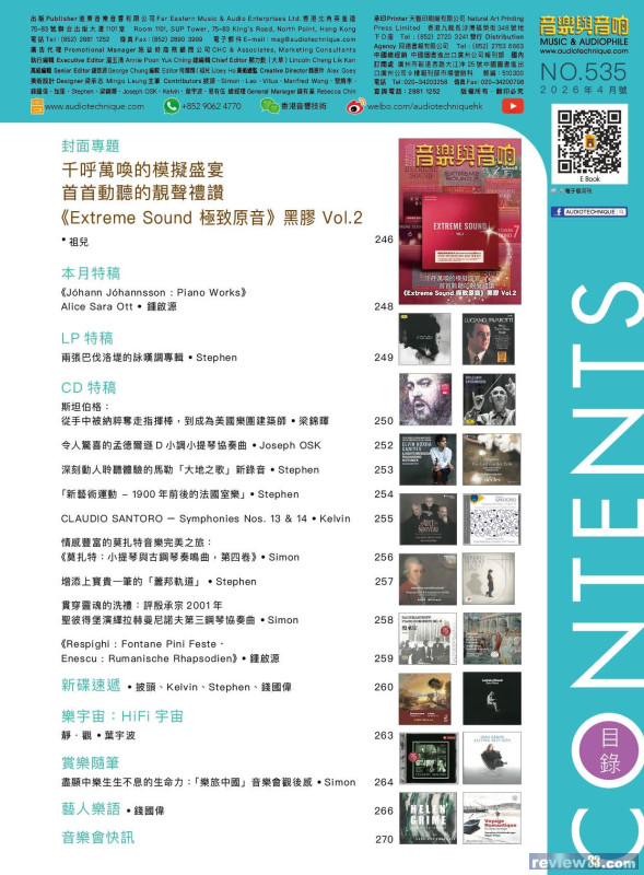 今期的音樂與音响封面專題 : 千呼萬喚的模擬盛宴《Extreme Sound 極致原音》黑膠 Vol.2 。本月特稿 : 《Jóhann Jóhannsson : Piano Works》Alice Sara Ott。LP特稿 : 兩張巴伐洛堤的詠嘆調專輯。CD特稿 :斯坦伯格:從手中被納粹奪走指揮棒,到成為美國樂團建築師、令人驚喜的孟德爾遜D小調小提琴協奏曲、深刻動人聆聽體驗的馬勒「大地之歌」新錄音、「新藝術運動 - 1900年前後的法國室樂」、CLAUDIO SANTORO – Symphonies Nos. 13 & 14、《莫扎特:小提琴與古鋼琴奏鳴曲,第四卷》 ,增添上寶貴一筆的「蕭邦軌道」、評殷承宗2001年聖彼得堡演繹拉赫曼尼諾夫第三鋼琴協奏曲、《Respighi : Fontane Pini Feste・Enescu : Rumanische Rhapsodien》。其餘的新碟速遞 、賞樂隨筆、HiFi宇宙、藝人樂語 …等等欄目也是同樣內容豐富,記緊捧場啊!