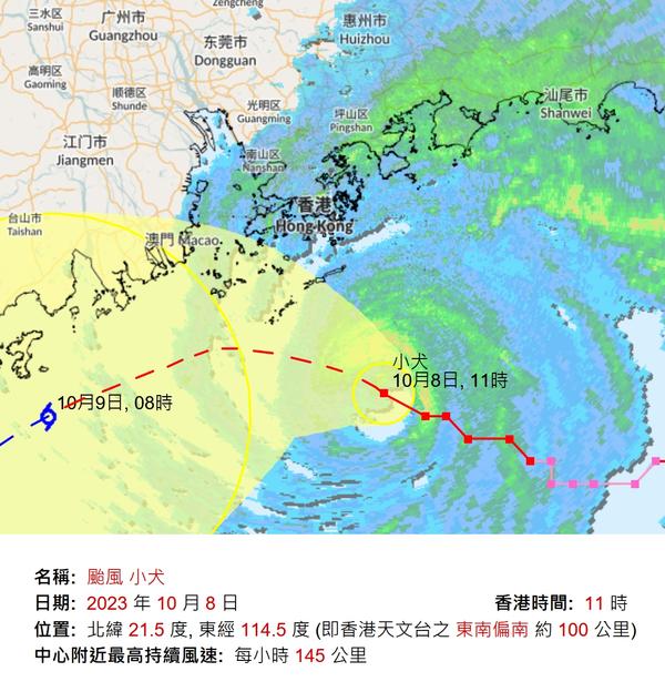 | [#55] 小犬颱風路徑 天文台 : 會在今日中午12時至下午2時改掛8號風球 https://hk.on.cc/hk/bkn/cnt/news/20231008/bkn-20231008015936465-1008_00822_001.html |